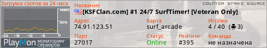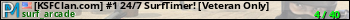 [KSFClan.com] #1 24/7 SurfTimer! [Veteran Only] представлен в виде сервера ксс. Из всех имеющихся на сайте модификаций игровых серверов, наша система поставила метку Surf сервера css. В нашем мониторинге игровых серверов вы так же можете найти быструю навигацию по всем меткам - используйте главную страницу игры Counter Strike Source.