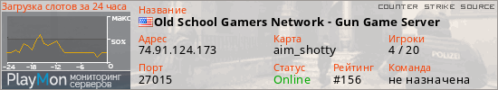 Old School Gamers Network - Gun Game Server представлен в виде сервера ксс. Из всех имеющихся на сайте модификаций игровых серверов, наша система поставила метку GunGame сервера css. В нашем мониторинге игровых серверов вы так же можете найти быструю навигацию по всем меткам - используйте главную страницу игры Counter Strike Source.