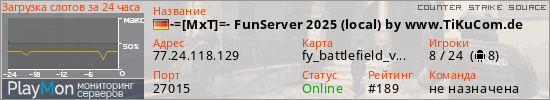 -=[MxT]=- FunServer 2025 (local) by www.TiKuCom.de представлен в виде сервера ксс. Из всех имеющихся на сайте модификаций игровых серверов, вам может понравиться DeathRun серверы css. А для быстрой навигации по всем меткам - используйте главную страницу игры Counter Strike Source.