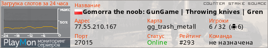 Gomorra the noob: GunGame | Throwing knives | Grenades представлен в виде сервера ксс. Из всех имеющихся на сайте модификаций игровых серверов, наша система поставила метку GunGame сервера css. В нашем мониторинге игровых серверов вы так же можете найти быструю навигацию по всем меткам - используйте главную страницу игры Counter Strike Source.