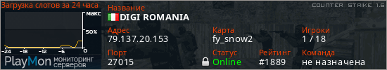 DIGI ROMANIA представлен в виде сервера кс 1.6. Из всех имеющихся на сайте модификаций игровых серверов, наша система поставила метку Furien Mod сервера cs. В нашем мониторинге игровых серверов вы так же можете найти быструю навигацию по всем меткам - используйте главную страницу игры Counter Strike 1.6.