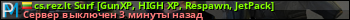 cs.rez.lt Surf [GunXP, HIGH XP, Respawn, JetPack] представлен в виде сервера кс 1.6. Из всех имеющихся на сайте модификаций игровых серверов, наша система поставила метку Surf сервера cs. В нашем мониторинге игровых серверов вы так же можете найти быструю навигацию по всем меткам - используйте главную страницу игры Counter Strike 1.6.