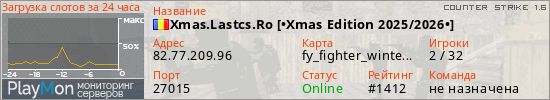 Xmas.Lastcs.Ro [•Xmas Edition 2025/2026•] представлен в виде сервера кс 1.6. Из всех имеющихся на сайте модификаций игровых серверов, вам может понравиться GunGame серверы cs. А для быстрой навигации по всем меткам - используйте главную страницу игры Counter Strike 1.6.
