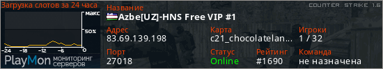 Azbe[UZ]-HNS Free VIP #1 представлен в виде сервера кс 1.6. Из всех имеющихся на сайте модификаций игровых серверов, наша система поставила метку Hide'n'Seek сервера cs. В нашем мониторинге игровых серверов вы так же можете найти быструю навигацию по всем меткам - используйте главную страницу игры Counter Strike 1.6.