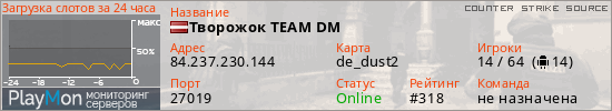 Творожок TEAM DM представлен в виде сервера ксс. Из всех имеющихся на сайте модификаций игровых серверов, наша система поставила метку DeathMatch сервера css. В нашем мониторинге игровых серверов вы так же можете найти быструю навигацию по всем меткам - используйте главную страницу игры Counter Strike Source.