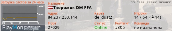 Творожок DM FFA представлен в виде сервера ксс. Из всех имеющихся на сайте модификаций игровых серверов, наша система поставила метку DeathMatch сервера css. В нашем мониторинге игровых серверов вы так же можете найти быструю навигацию по всем меткам - используйте главную страницу игры Counter Strike Source.