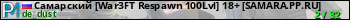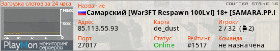 Самарский [War3FT Respawn 100Lvl] 18+ [SAMARA.PP.RU] представлен в виде сервера кс 1.6. Из всех имеющихся на сайте модификаций игровых серверов, наша система поставила метку War3FT сервера cs. В нашем мониторинге игровых серверов вы так же можете найти быструю навигацию по всем меткам - используйте главную страницу игры Counter Strike 1.6.