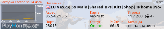 EU Vex.gg 5x Main|Shared BPs|Kits|Shop|TPhome|Noob Friendly10x5 представлен в виде сервера раст. Из всех имеющихся на сайте модификаций игровых серверов, наша система поставила метку Kits сервера rust. В нашем мониторинге игровых серверов вы так же можете найти быструю навигацию по всем меткам - используйте главную страницу игры Rust.