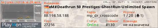xM#Deathrun 50 Prestiges-GhostRun-Unlimited Spawn представлен в виде сервера код 4. Из всех имеющихся на сайте модификаций игровых серверов, наша система поставила метку DeathRun сервера cod4. В нашем мониторинге игровых серверов вы так же можете найти быструю навигацию по всем меткам - используйте главную страницу игры Call of Duty 4: Modern Warfare.