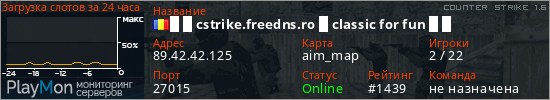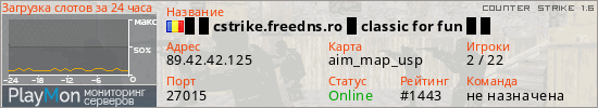 █ █ cstrike.freedns.ro █ classic for fun █ █ представлен в виде сервера кс 1.6. Из всех имеющихся на сайте модификаций игровых серверов, наша система поставила метку Classic сервера cs. В нашем мониторинге игровых серверов вы так же можете найти быструю навигацию по всем меткам - используйте главную страницу игры Counter Strike 1.6.