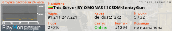 This Server BY OMONAS !!! CSDM-SentryGun представлен в виде сервера кс 1.6. Из всех имеющихся на сайте модификаций игровых серверов, наша система поставила метку Пушки + Лазеры сервера cs. В нашем мониторинге игровых серверов вы так же можете найти быструю навигацию по всем меткам - используйте главную страницу игры Counter Strike 1.6.