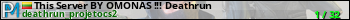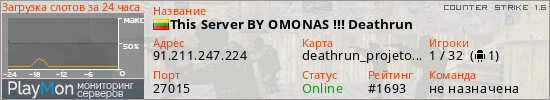 This Server BY OMONAS !!! Deathrun представлен в виде сервера кс 1.6. Из всех имеющихся на сайте модификаций игровых серверов, наша система поставила метку DeathRun сервера cs. В нашем мониторинге игровых серверов вы так же можете найти быструю навигацию по всем меткам - используйте главную страницу игры Counter Strike 1.6.