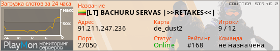 [LT] BACHURU SERVAS |>>RETAKES<<| представлен в виде сервера кс 2. Из всех имеющихся на сайте модификаций игровых серверов, наша система поставила метку Retake сервера cs2. В нашем мониторинге игровых серверов вы так же можете найти быструю навигацию по всем меткам - используйте главную страницу игры Counter Strike 2.