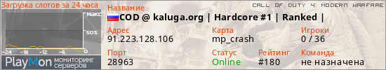 COD @ kaluga.org | Hardcore #1 | Ranked | представлен в виде сервера код 4. Из всех имеющихся на сайте модификаций игровых серверов, наша система поставила метку HardCore сервера cod4. В нашем мониторинге игровых серверов вы так же можете найти быструю навигацию по всем меткам - используйте главную страницу игры Call of Duty 4: Modern Warfare.