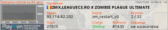 ZMX.LEAGUECS.RO # ZOMBIE PLAGUE ULTIMATE представлен в виде сервера кс 1.6. Из всех имеющихся на сайте модификаций игровых серверов, наша система поставила метку Zombie сервера cs. В нашем мониторинге игровых серверов вы так же можете найти быструю навигацию по всем меткам - используйте главную страницу игры Counter Strike 1.6.