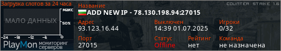 ADD NEW IP - 78.130.198.94:27015 представлен в виде сервера кс 1.6. Из всех имеющихся на сайте модификаций игровых серверов, вам может понравиться Knife серверы cs. А для быстрой навигации по всем меткам - используйте главную страницу игры Counter Strike 1.6.