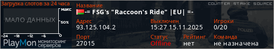 -= FSG's "Raccoon's Ride" |EU| =- представлен в виде сервера ксс. Из всех имеющихся на сайте модификаций игровых серверов, вам может понравиться DeathRun серверы css. А для быстрой навигации по всем меткам - используйте главную страницу игры Counter Strike Source.