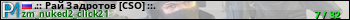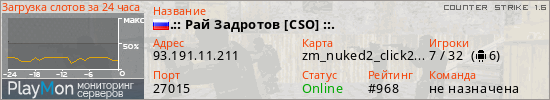 .:: Рай Задротов [CSO] ::. представлен в виде сервера кс 1.6. Из всех имеющихся на сайте модификаций игровых серверов, наша система поставила метку Zombie сервера cs. В нашем мониторинге игровых серверов вы так же можете найти быструю навигацию по всем меткам - используйте главную страницу игры Counter Strike 1.6.
