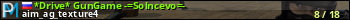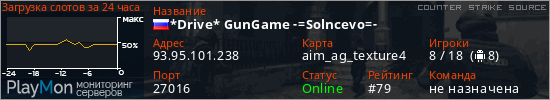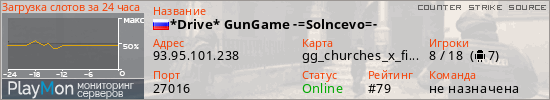 *Drive* GunGame -=Solncevo=- представлен в виде сервера ксс. Из всех имеющихся на сайте модификаций игровых серверов, наша система поставила метку GunGame сервера css. В нашем мониторинге игровых серверов вы так же можете найти быструю навигацию по всем меткам - используйте главную страницу игры Counter Strike Source.