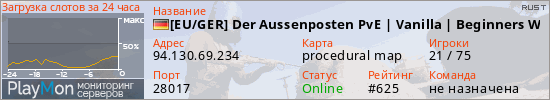 [EU/GER] Der Aussenposten PvE | Vanilla | Beginners Welcome представлен в виде сервера раст. Из всех имеющихся на сайте модификаций игровых серверов, вам может понравиться Kits серверы rust. А для быстрой навигации по всем меткам - используйте главную страницу игры Rust.