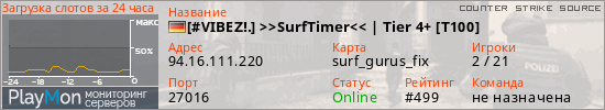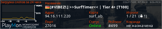 [#VIBEZ!.] >>SurfTimer<< | Tier 4+ [T100] представлен в виде сервера ксс. Из всех имеющихся на сайте модификаций игровых серверов, наша система поставила метку Surf сервера css. В нашем мониторинге игровых серверов вы так же можете найти быструю навигацию по всем меткам - используйте главную страницу игры Counter Strike Source.