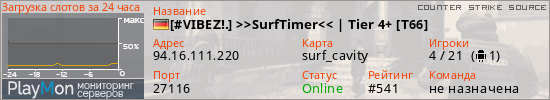 [#VIBEZ!.] >>SurfTimer<< | Tier 4+ [T66] представлен в виде сервера ксс. Из всех имеющихся на сайте модификаций игровых серверов, наша система поставила метку Surf сервера css. В нашем мониторинге игровых серверов вы так же можете найти быструю навигацию по всем меткам - используйте главную страницу игры Counter Strike Source.