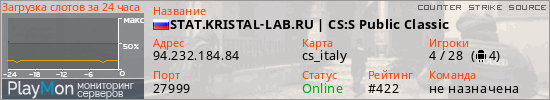 STAT.KRISTAL-LAB.RU | CS:S Public Classic представлен в виде сервера ксс. Из всех имеющихся на сайте модификаций игровых серверов, наша система поставила метку Classic сервера css. В нашем мониторинге игровых серверов вы так же можете найти быструю навигацию по всем меткам - используйте главную страницу игры Counter Strike Source.