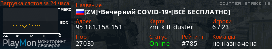 [ZM]•Вечерний COVID-19•[ВСЁ БЕСПЛАТНО] представлен в виде сервера кс 1.6. Из всех имеющихся на сайте модификаций игровых серверов, наша система поставила метку Zombie сервера cs. В нашем мониторинге игровых серверов вы так же можете найти быструю навигацию по всем меткам - используйте главную страницу игры Counter Strike 1.6.