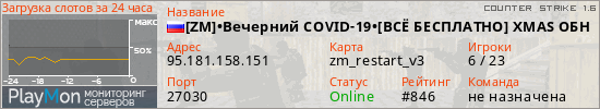 [ZM]•Вечерний COVID-19•[ВСЁ БЕСПЛАТНО] XMAS ОБНОВА представлен в виде сервера кс 1.6. Из всех имеющихся на сайте модификаций игровых серверов, наша система поставила метку Zombie сервера cs. В нашем мониторинге игровых серверов вы так же можете найти быструю навигацию по всем меткам - используйте главную страницу игры Counter Strike 1.6.