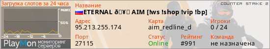 ETERNAL 🥇 AIM [!ws !shop !vip !bp] представлен в виде сервера кс 2. Из всех имеющихся на сайте модификаций игровых серверов, наша система поставила метку AIM сервера cs2. В нашем мониторинге игровых серверов вы так же можете найти быструю навигацию по всем меткам - используйте главную страницу игры Counter Strike 2.