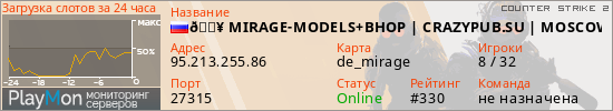 🔥 MIRAGE-MODELS+BHOP | CRAZYPUB.SU | MOSCOW представлен в виде сервера кс 2. Из всех имеющихся на сайте модификаций игровых серверов, вам может понравиться Retake серверы cs2. А для быстрой навигации по всем меткам - используйте главную страницу игры Counter Strike 2.