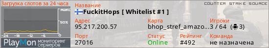 FuckitHops [ Whitelist #1 ] представлен в виде сервера ксс. Из всех имеющихся на сайте модификаций игровых серверов, вам может понравиться GunGame серверы css. А для быстрой навигации по всем меткам - используйте главную страницу игры Counter Strike Source.