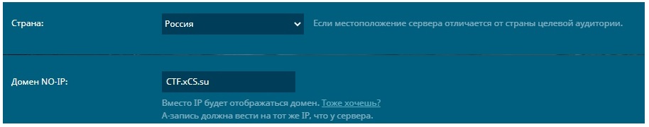 И так же ввели строку управления NO-IP адресом, теперь можно менять отображаемый адрес, но необходимо что бы А-запись домена вела на тот же IP, который указан у сервера. А получить красивый адрес NO-IP можно здесь: